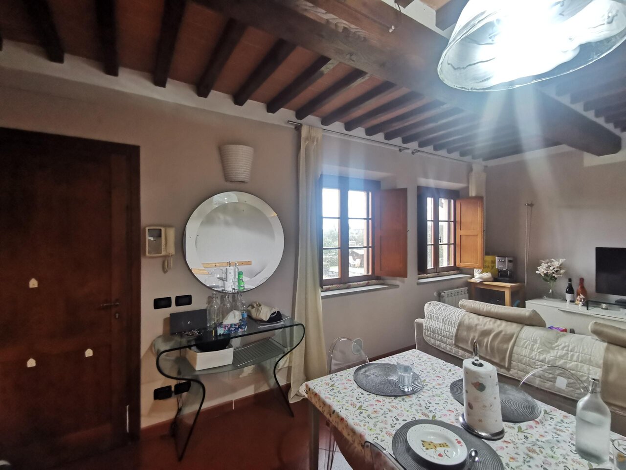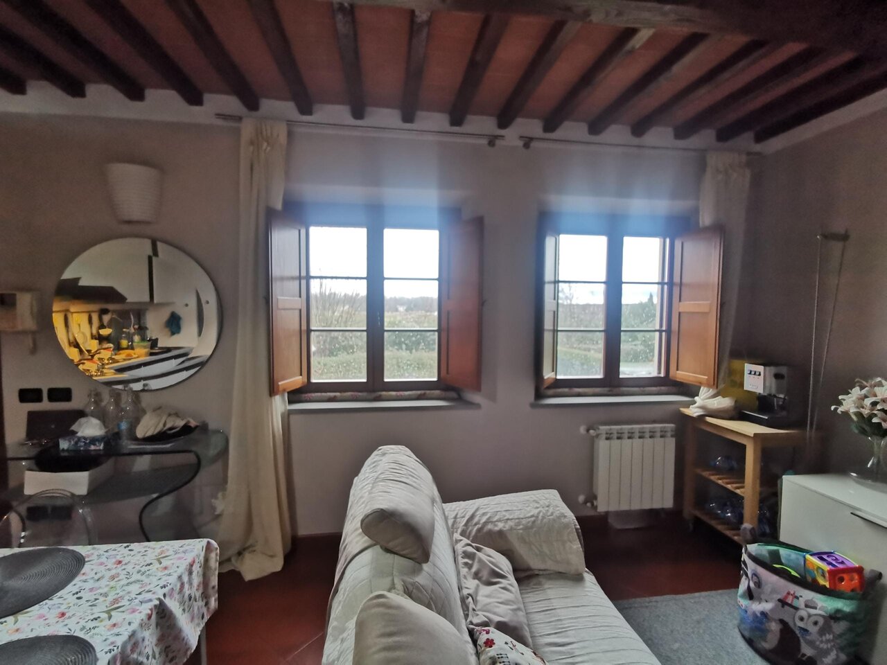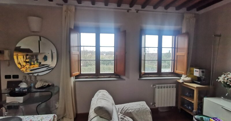 Lucca,Guamo, in bella posizione nel verde lontano dal traffico con bellissimi affacci, zona servita, proponiamo appartamento posto al piano primo di piccola fabbricato colonico, ristrutturato pochi anni fa , in contesto residenziale tranquillo e di prestigio. Composto da:ingresso, soggiorno-angolo cottura, camera, sutdio, bagno e piccolo ripostiglio corredato da posti auto ed ampio terreno recintato privato di fronte a casa con casetta accessoriata di seconda cucina oltre ad ampio piazzale a comune . L'appartamento viene venduto parzialmente arredato . Finiture interne:pavimenti cotto e parquet, infissi esterni con vetri camera-legno, porte in legno, termoautonomo con caldaia a gas metano, zanzariere, soffitti travicelli e mezzane ape classe e epgl 60,15 kwh/mq anno